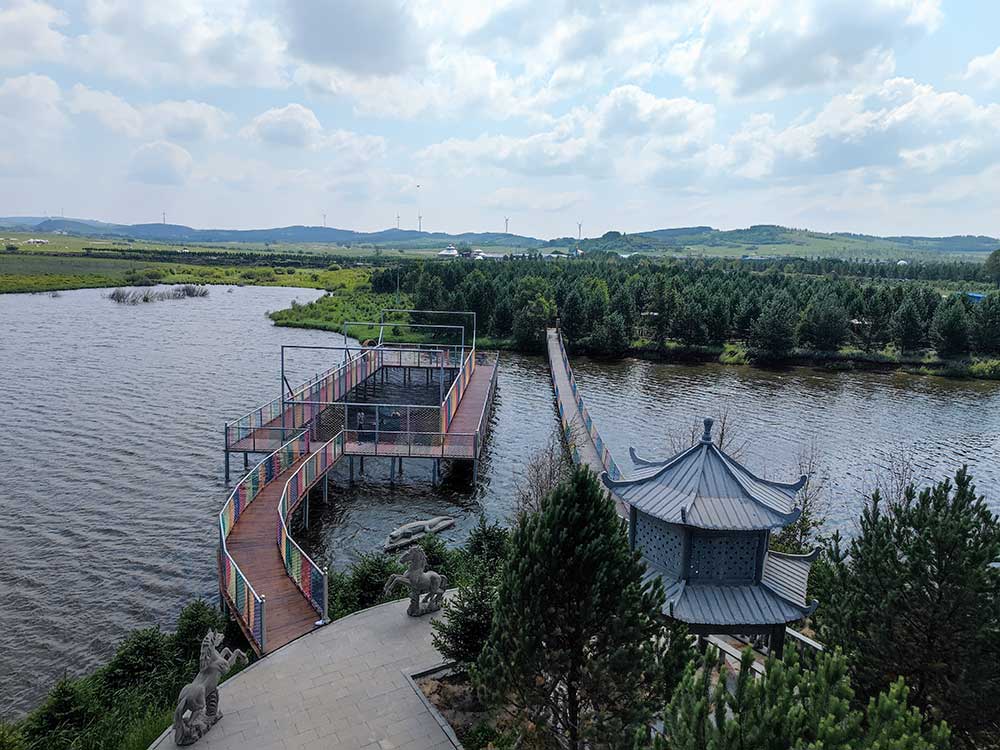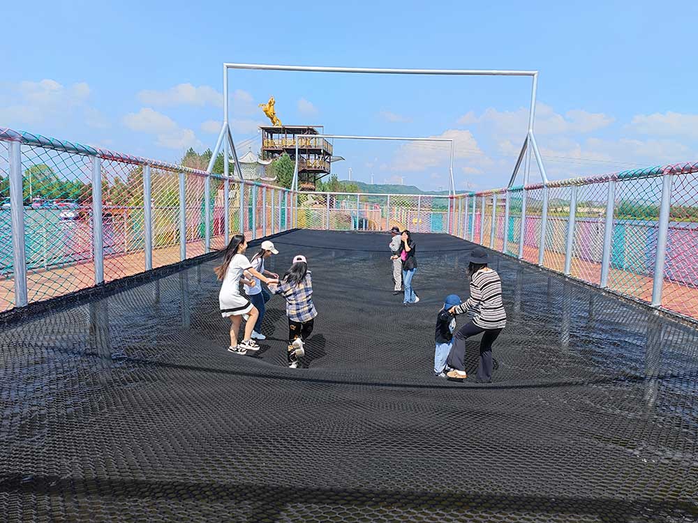 水上蹦床:300平米水上蹦床傍湖而建,映衬于湖光山色间,自成一景,给您带来“碧水蓝天共一色,青山绿水入画中”的神奇体验。